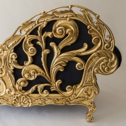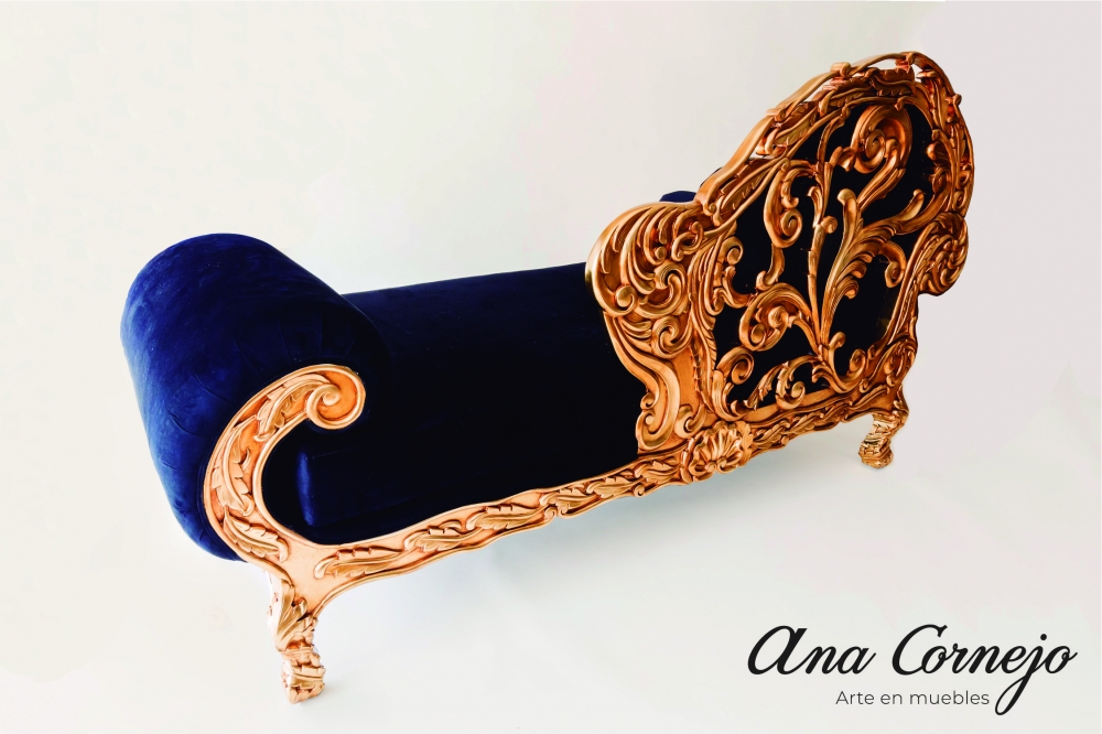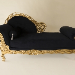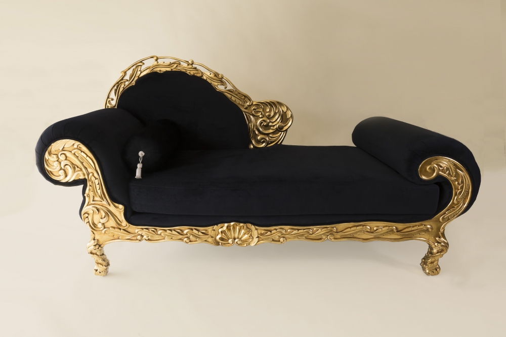 Chaise longue mod. Rococó, en madera de cedro, tallado a mano terminado en hoja de oro y terciopelo negro.