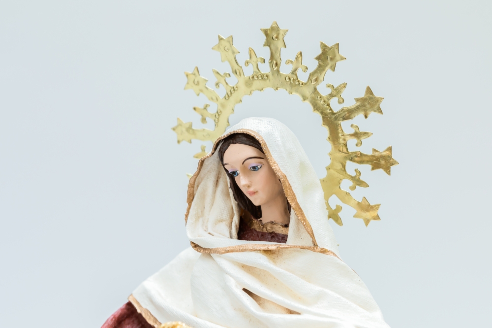 Virgen Desatanudos fabricada en tela encolada y resina.