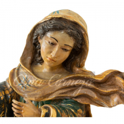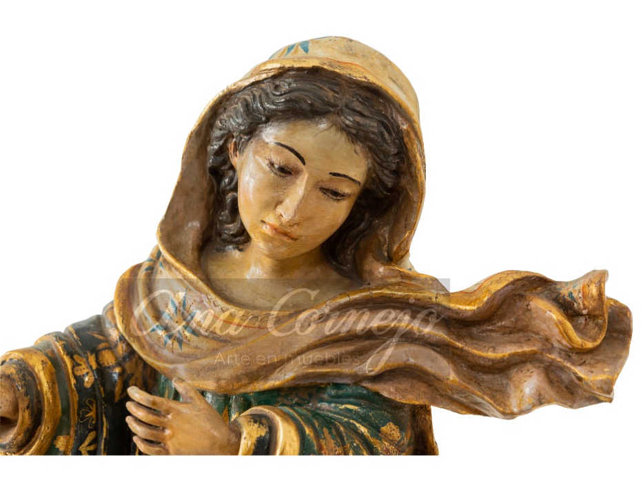 Virgen de la Inmaculada Concepción tallado en madera de cedro estufada; terminada en un policromado en hoja de oro con óleos